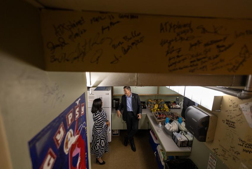 Texas Tribune CEO Sonal Shah, left, speaks with New Hampshire Gov. Chris Sununu backstage at the Paramount Theatre before Smith's one-on-one conversation with Sununu on Thursday, Sept. 21, 2023.